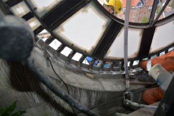 Standing at 42.7m a team of three Steeplejack engineers over a period of three weeks abseiled from the roof of Nottingham’s Council House to replace sections of steel on the clock face which had rusted and rotten over the years.