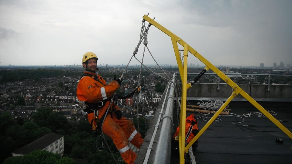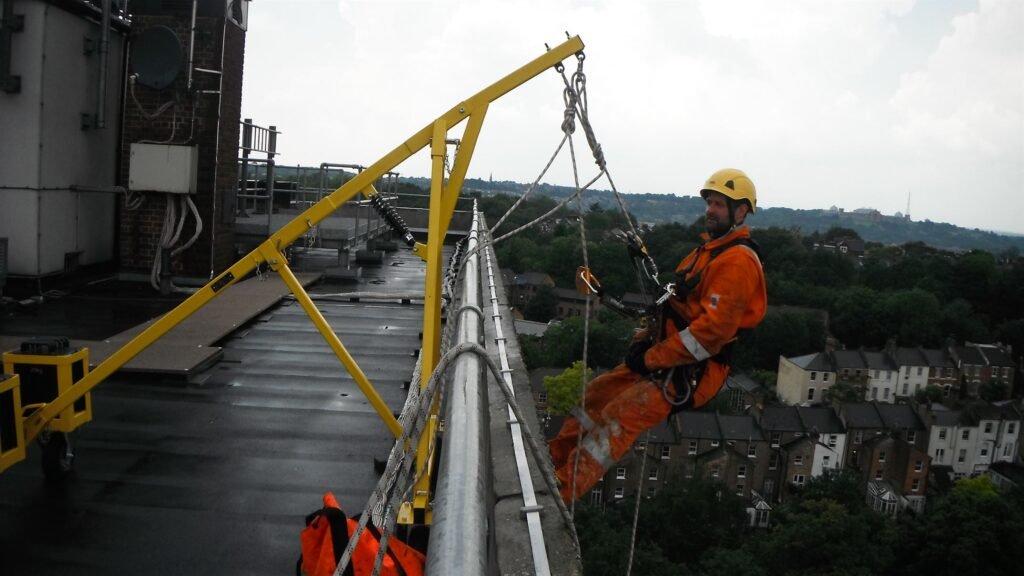 The first phase of the works were completed via external rope acess using the DW200 ‘A’ Frame Anchor system (Pictured below). This is rated for 2 man use, and was utilised for safe access for the installation of down conductors.